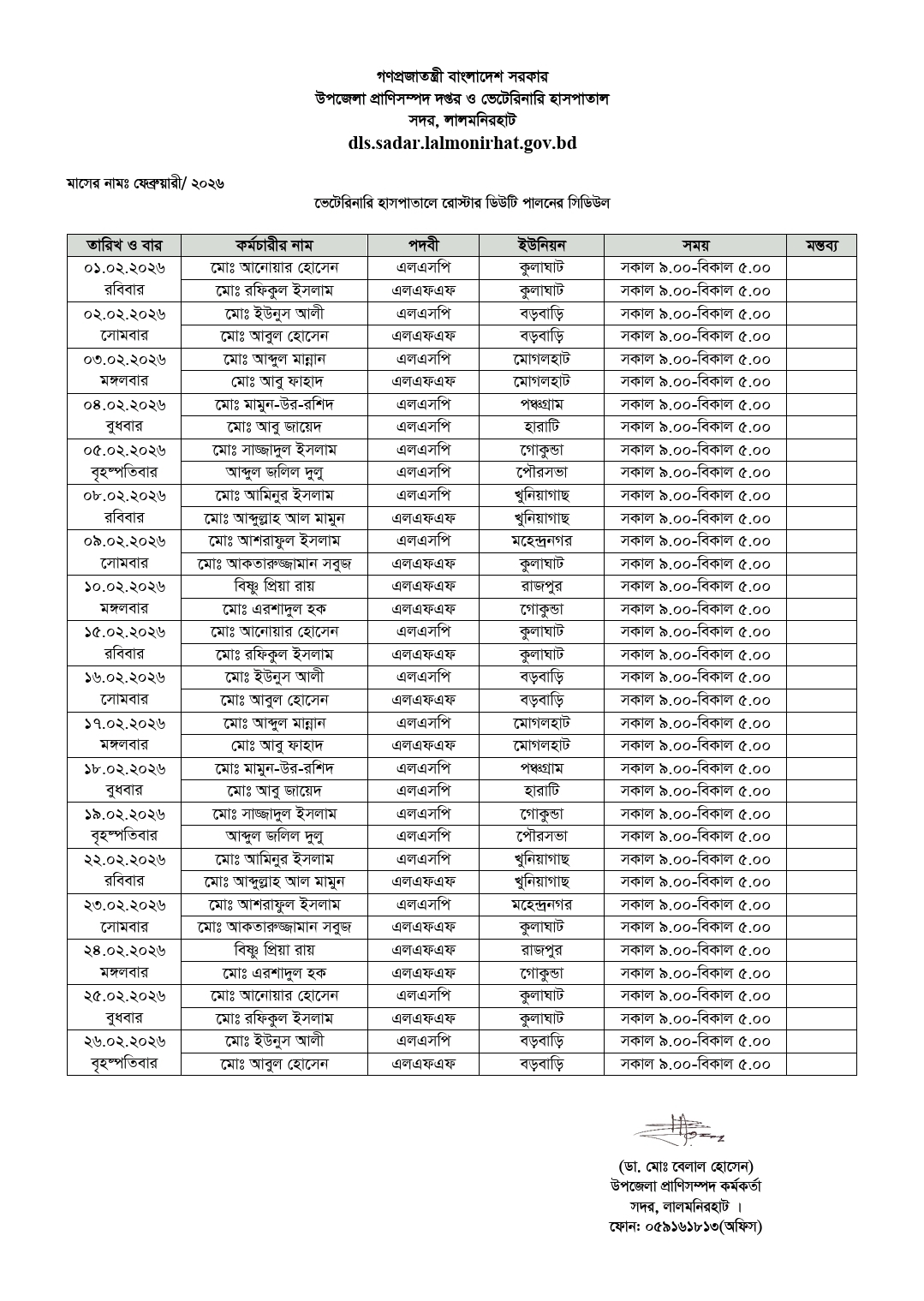 ফেব্রুয়ারী/২৬ মাসে অত্র দপ্তরে রোস্টার ডিউটি পালন প্রসঙ্গে।